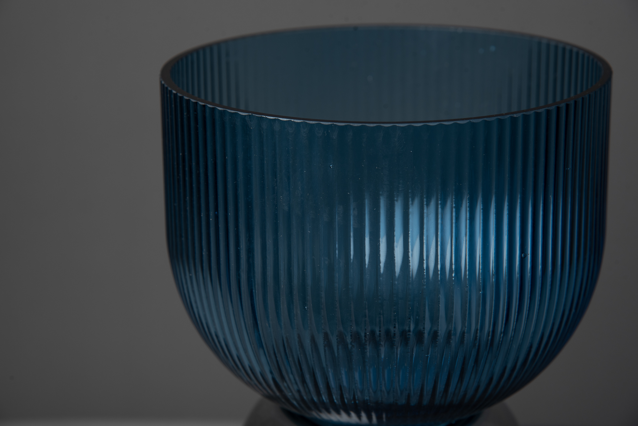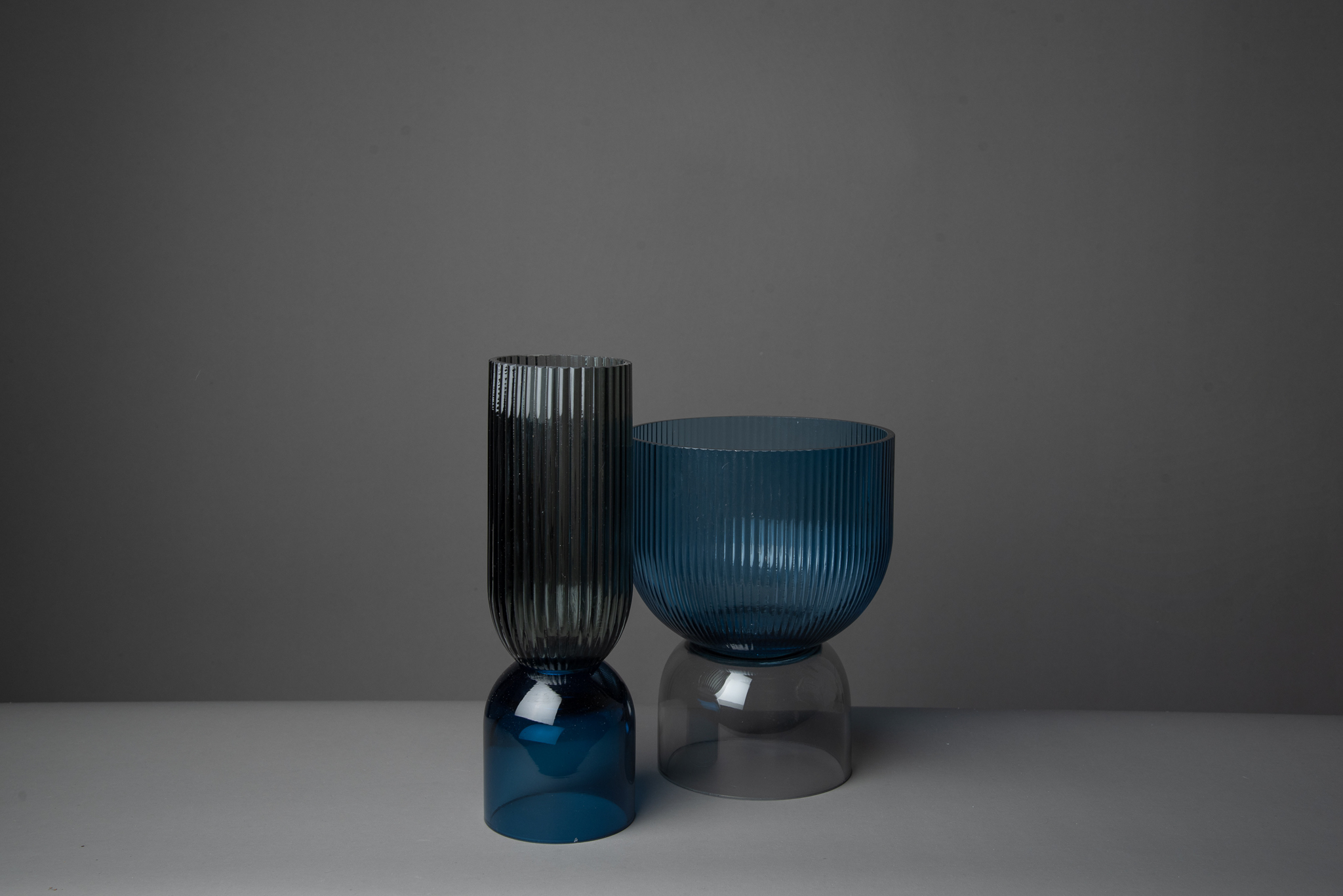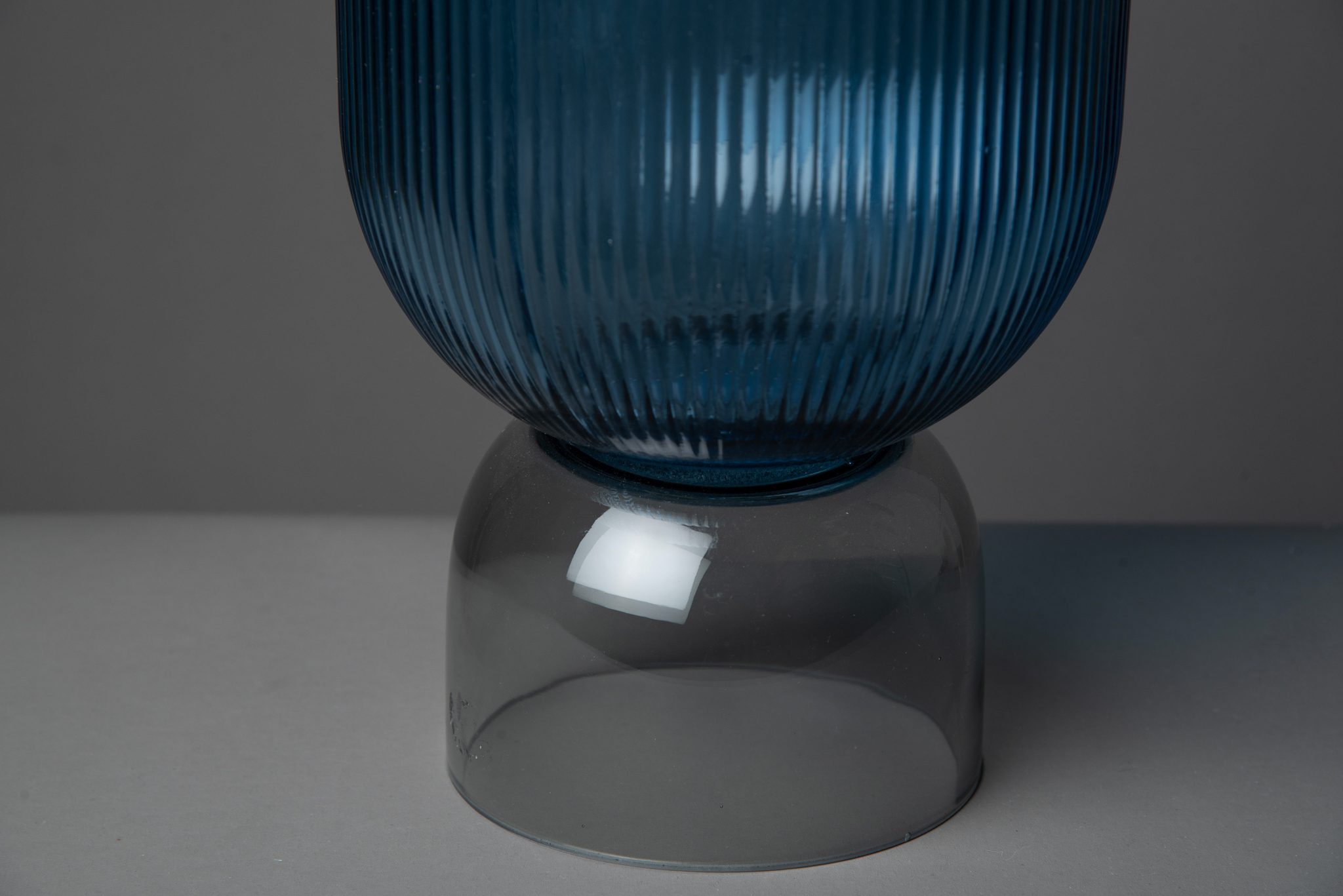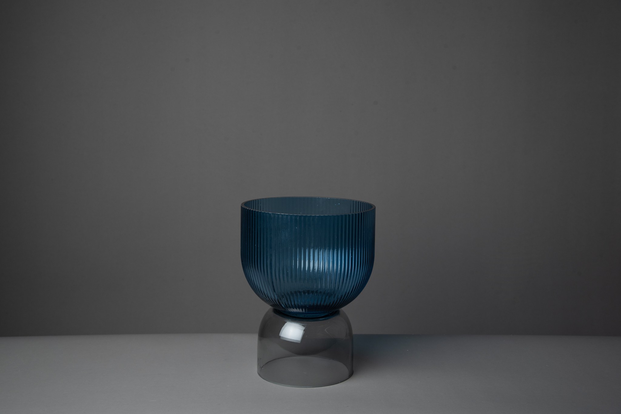 20x16cm. Vidrio en dos tonos: fumé y azul, acanalado en su parte azul. El Jarron Bari te invita a revivir los años 50s. Usalo al derecho y al revés, su diseño versatil los hace ver perfecto de ambas maneras. Usalo como florero, como candelero o un simplemente un objeto de diseño.