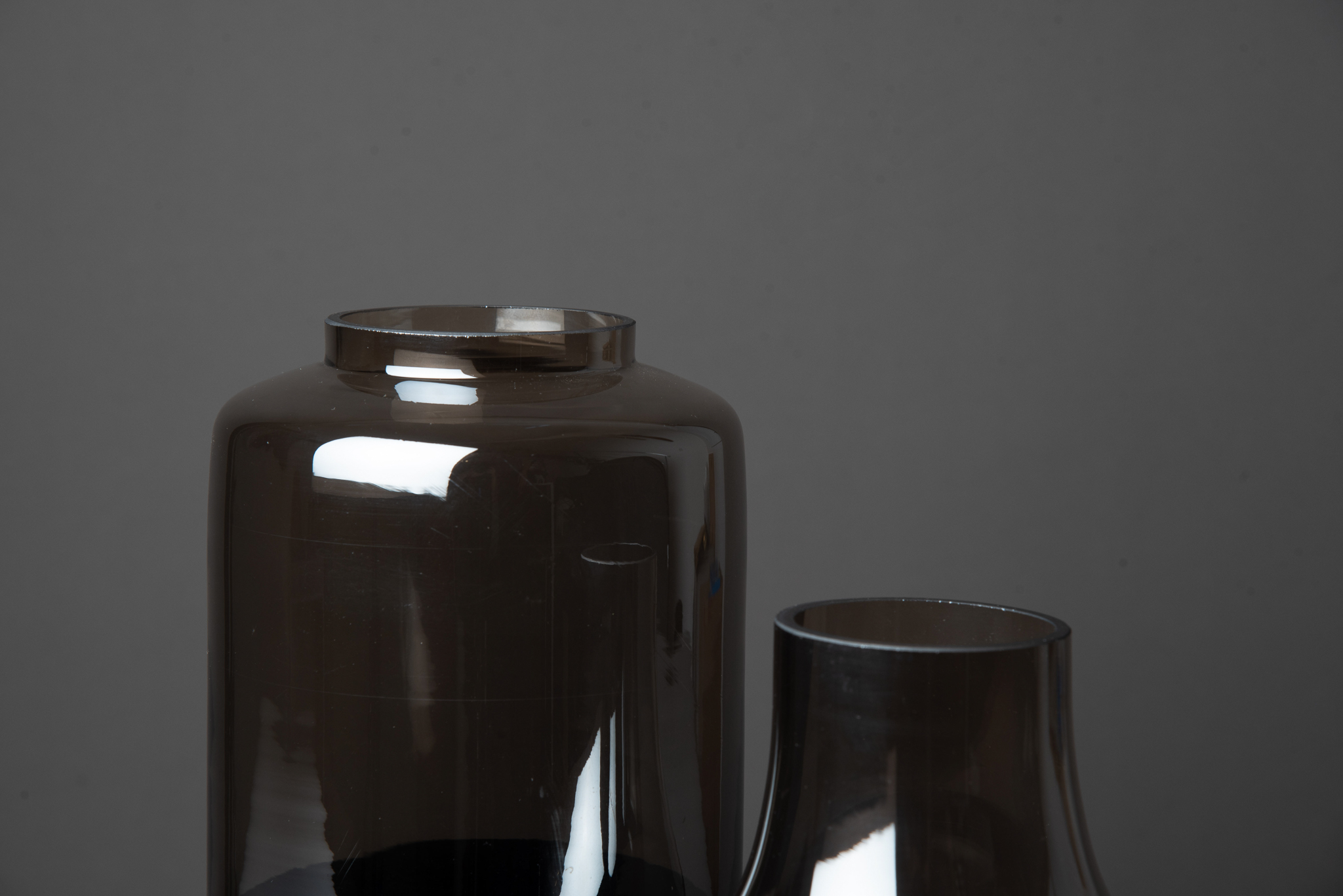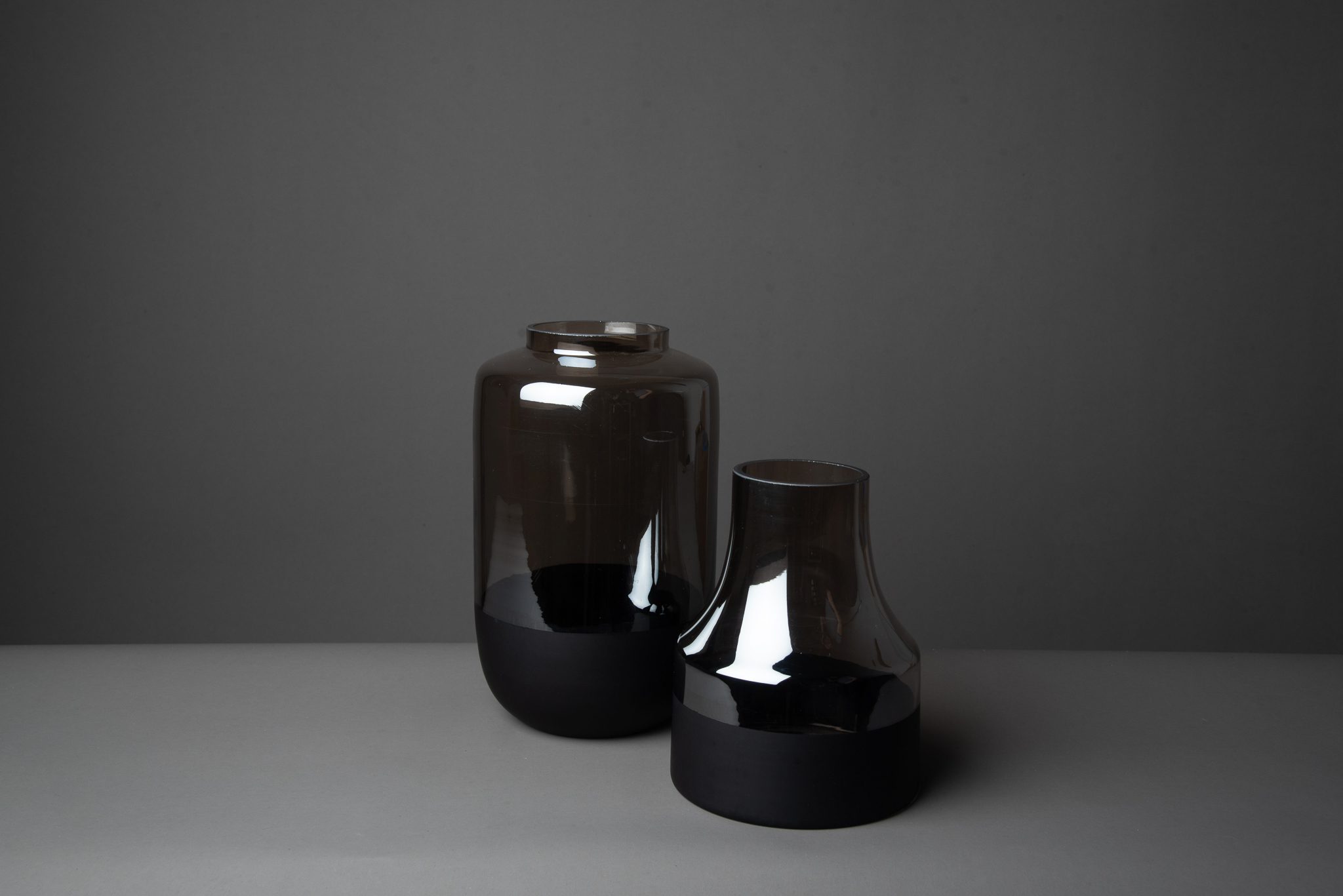 Elegante jarrón de vidrio color caramelo con base en negro mate. Usalo como florero o simplemente como un objeto de diseño. Acompañalo con su versión grande.