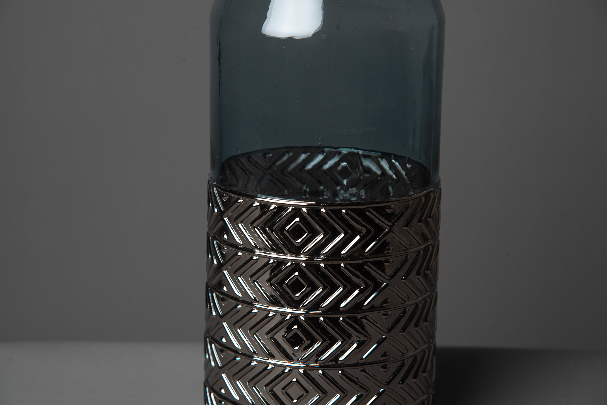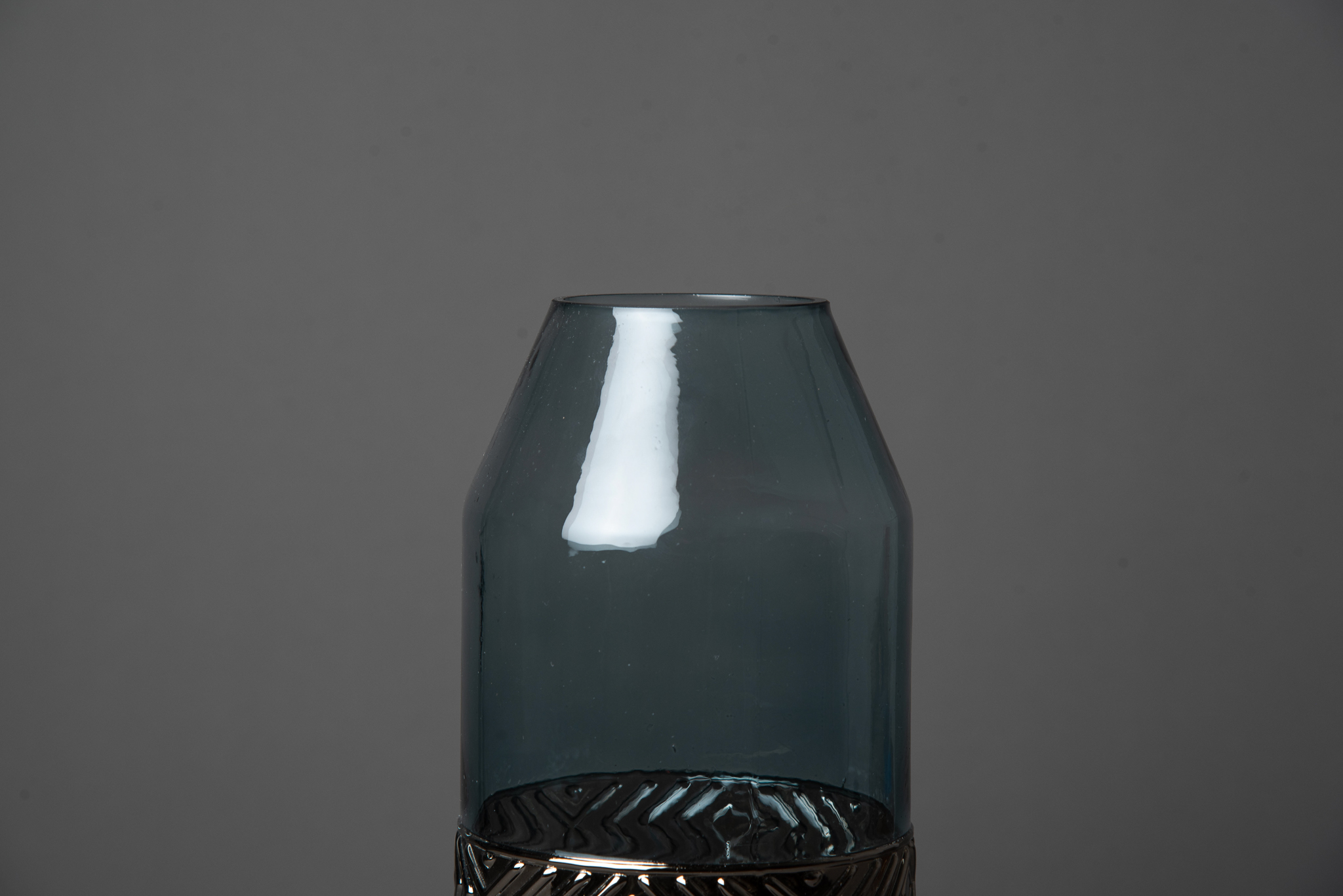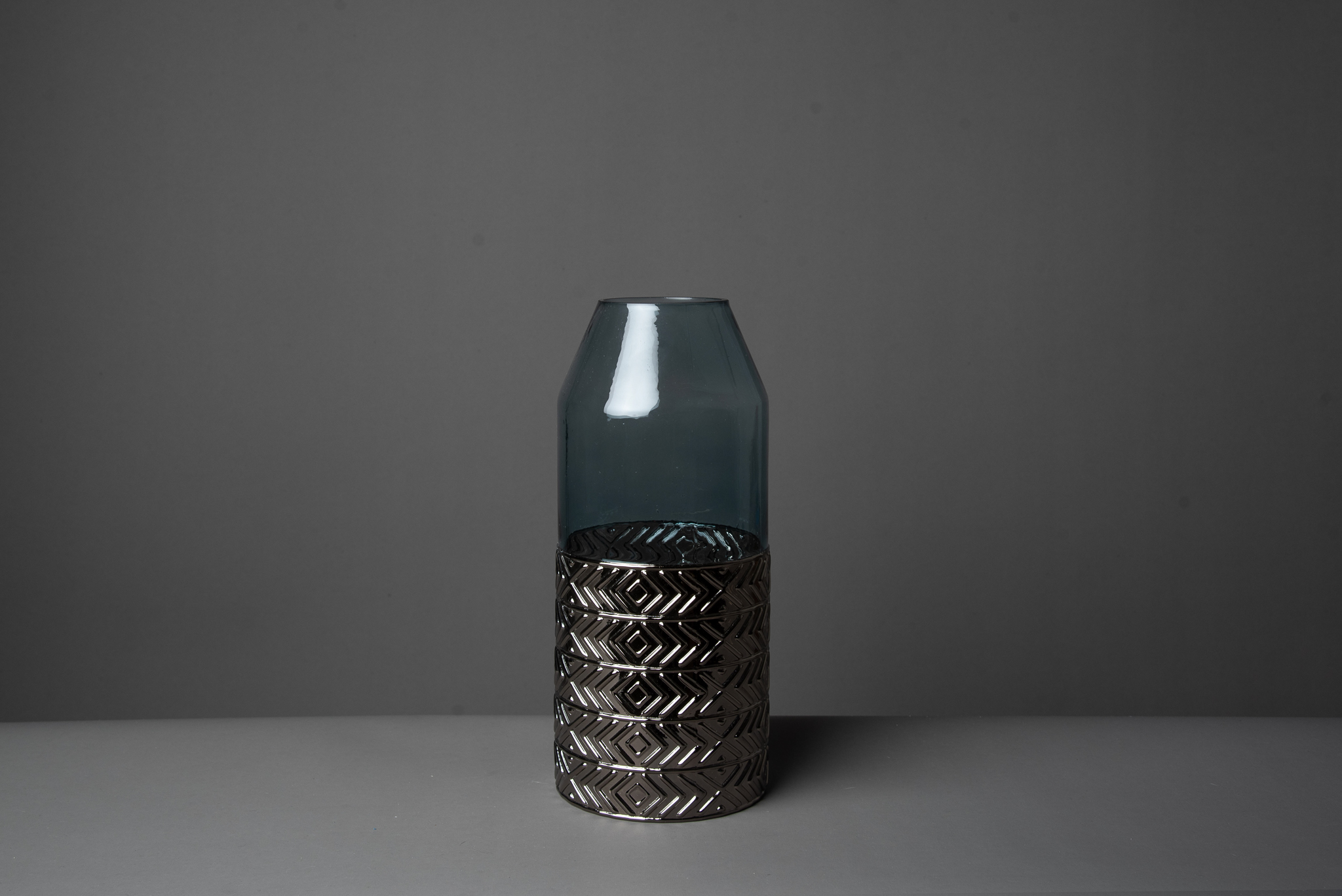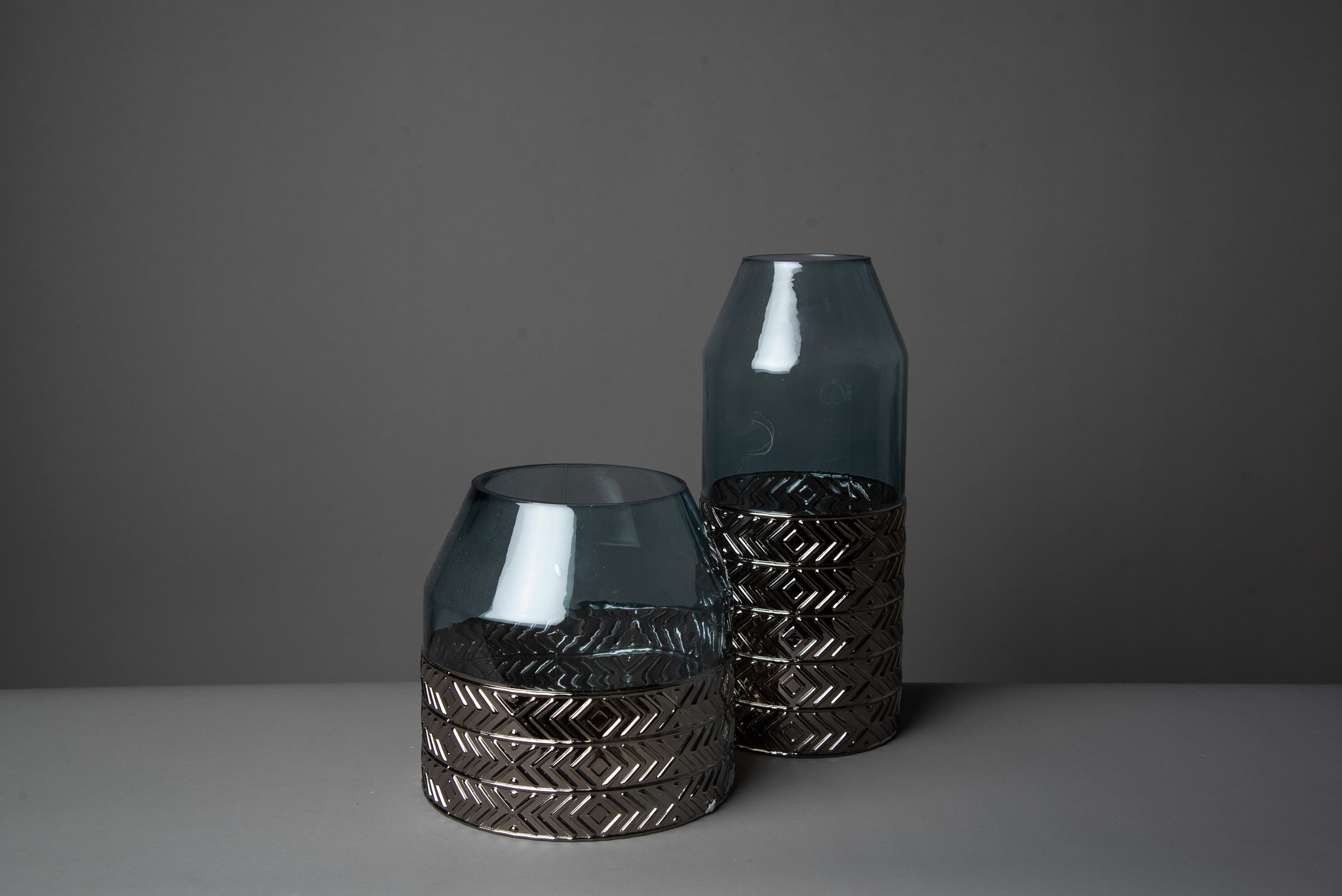 Jarrón de vidrio con base tramada de acabado metálico. Usalo como florero o simplemente como un objeto de diseño. Acompañalo con su versión pequeña.
